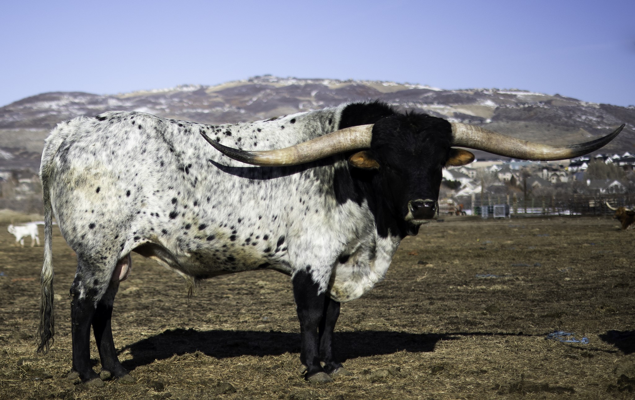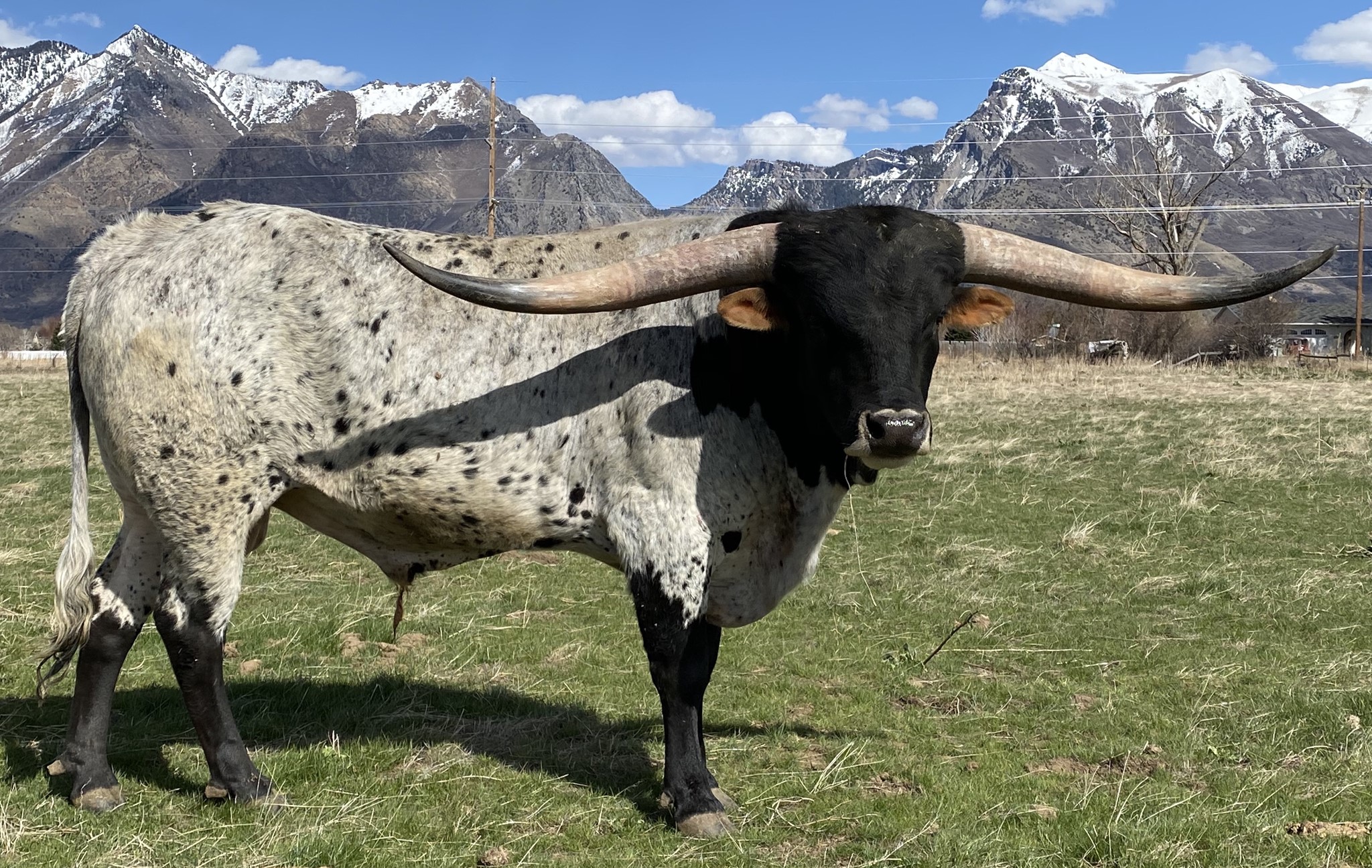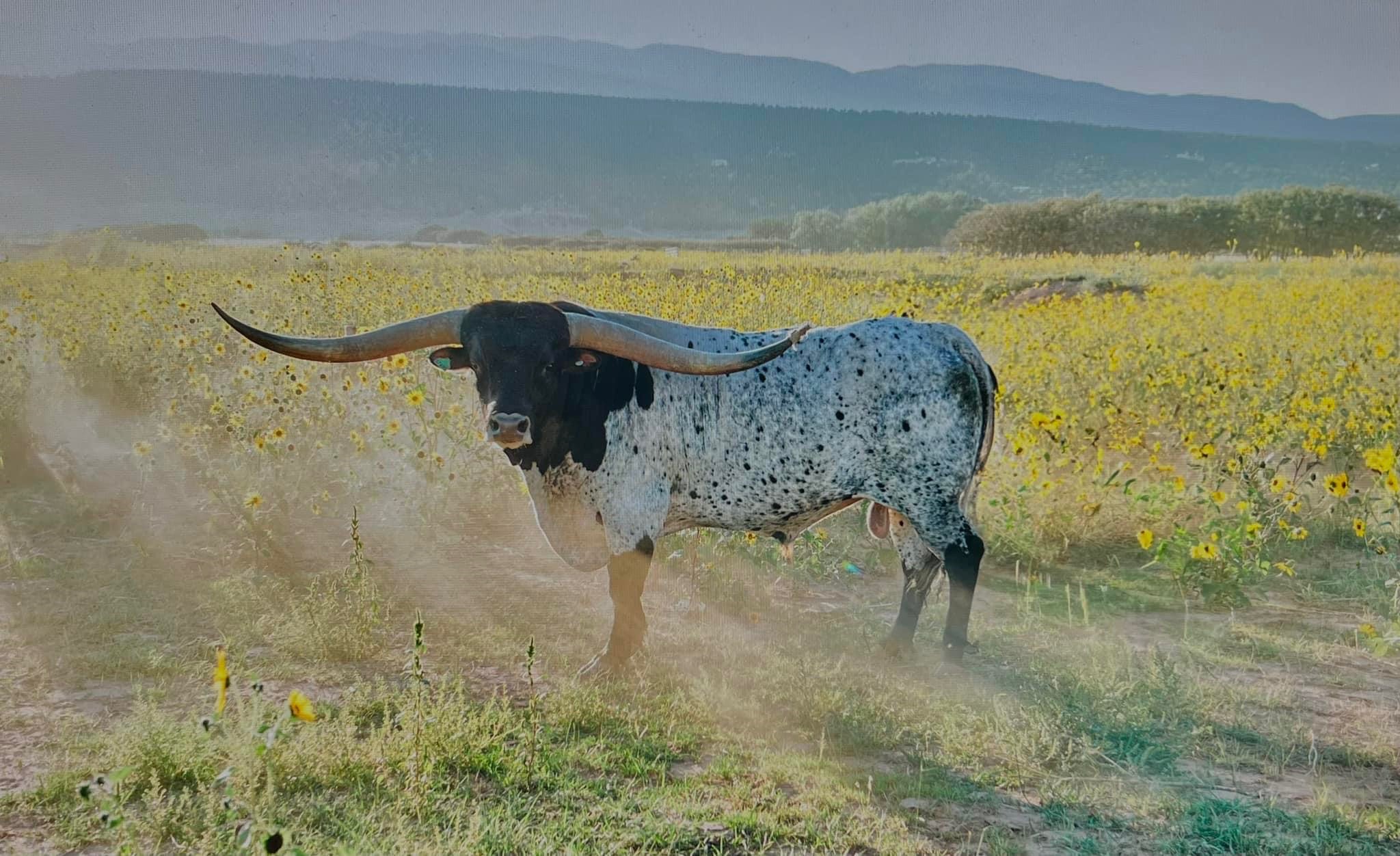 DSCC Cowboy Flair is an awesome herd sire. He is a 3x Horn Showcase Champion having won all three classes at 3 years old. He is very correct, has flawless conformation, and is a big boy all around. He is the son of the longest bull of all-time, Cowboy Tuff Chex. He measured 41" tip-to-tip on his first birthday and now measures 90.25” tip-to-tip. His first four calf crops have hit the ground and they are awesome! He’s throwing a lot of speckled calves, with great conformation. We are excited to see these babies grow up.