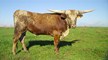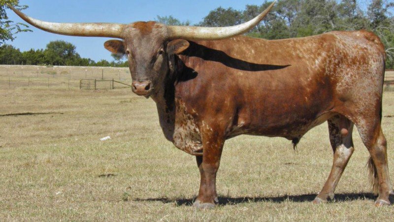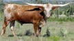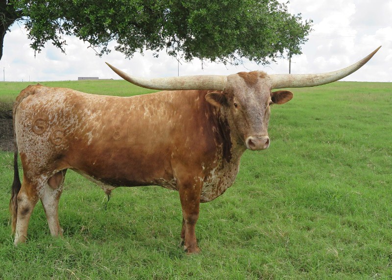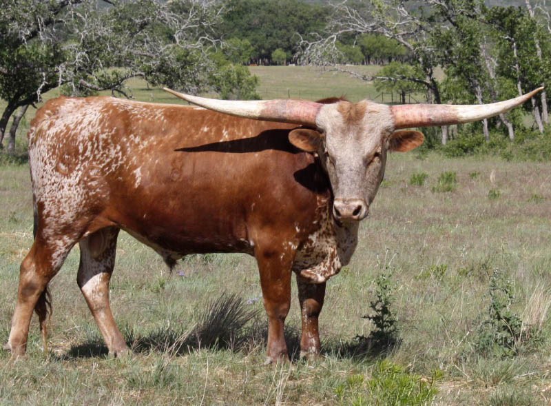 This incredible young bull is only the second longhorn bull to hit 70" TTT by 24 months. His first calves are now on the ground and his semen is available from the partners. Iron Hail is a real winner. 80.5" TTT at four. Winner of four Bronzes at LWC in 2012 and 2013. He is a prolific producer of big horns and colorful longhorns!